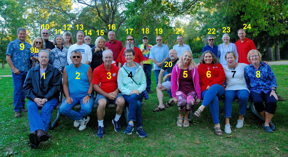My thanks to all those who made it as it's not much of reunion if no one shows up. Some special call outs for Paul (Ike) Eisenhauer for bringing a ton of brats, Debbie Hetzel for bringing subs and a corn hole game, Jean Crabtree for brownies and cheesecake squares, Mary Kay Luedke brought Old Fashions, and Parry Cartier brought watermelon, a corn hole game, plus Frisbee golf. George Karioris and Harry Profio had offered to bring their tents in case of rain or for shade, but the weather was perfect and our location offered plenty of shade. Finally, various people brought drinks to share.